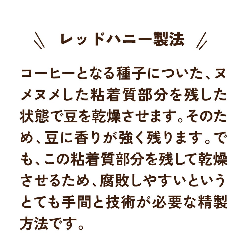コーヒーとなる種子についた、ヌメヌメした粘着質部分を残した状態で豆を乾燥させます。そのため、豆に香りが強く残ります。でも、この粘着質部分を残して乾燥させるため、しっかりとした品質管理を行わないと、腐敗してしまうという、とても手間と技術が必要な精製方法です。
