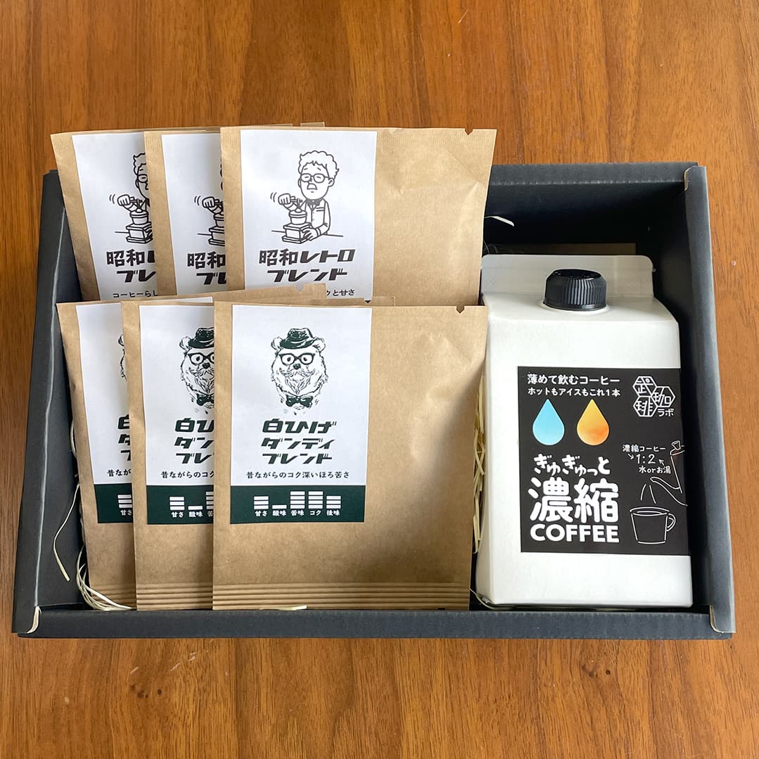 - 内容:濃縮コーヒー(500ml/1.5L相当×1) ドリップバッグ 6個(2~3種)